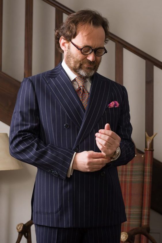 La chaqueta cruzada 6×4 con solapa de punta de lanza de 10 cm, ojal hecho a mano, bolsillo de pecho en «barchetta» y bolsillos inferiores rectos, con cerillera. Pantalón sin pinzas con el bolsillos inclinados, y ceñidores laterales con cintura limpia.
