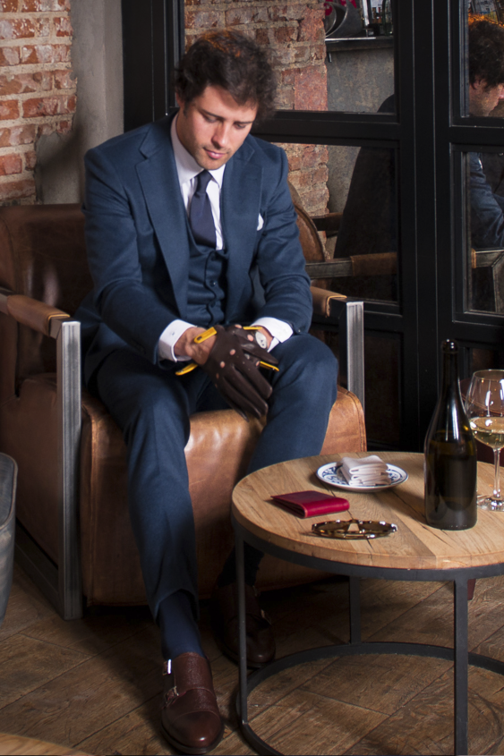 Traje a medida con solapa de muesca, con lo que sonseguimos un efecto mas casual. Confeccionado en un tejido 100% lana, de 300 gr. Chaqueta con solapa de muesca, ojal hecho a mano y bolsillos inferiores rectos con tapeta.
