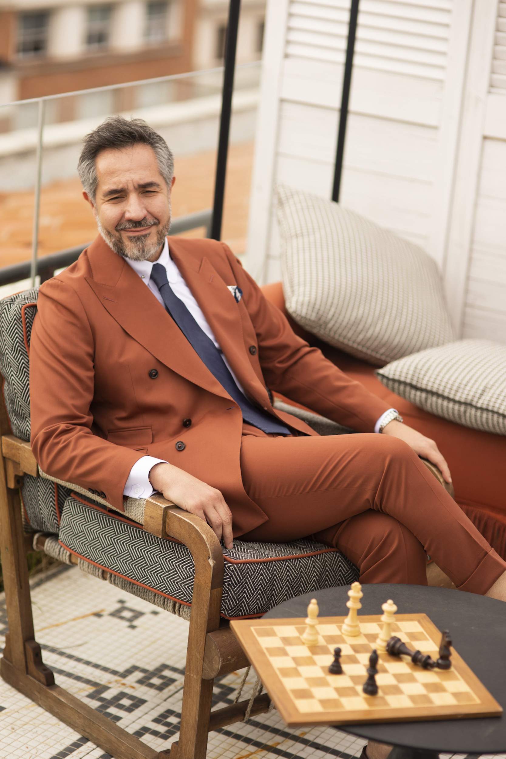 Traje a medida en tonalidad teja, confeccionaodlana fría super 120´s de Stylbiella.