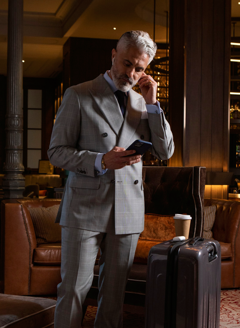 Traje a medida príncipe de gales, con tejido de lana fría de Stylbiella, en super 110´s con gramaje de 265 gr, con una caída y recuperación de arruga muy buenos.