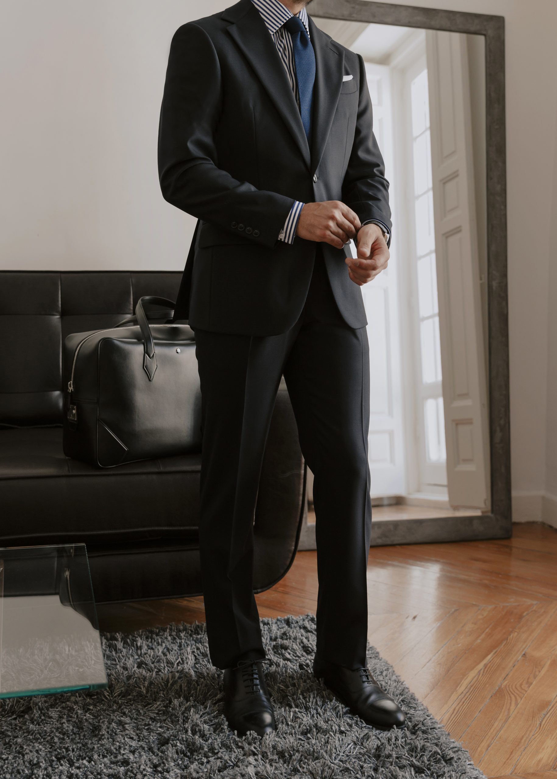 Traje a medida de  tres piezas 100% lana, super 140`s. Chaqueta con solapa de punta de lanza, ojal hecho a mano, picado en la solapa y bolsillos inferiores rectos con tapeta.