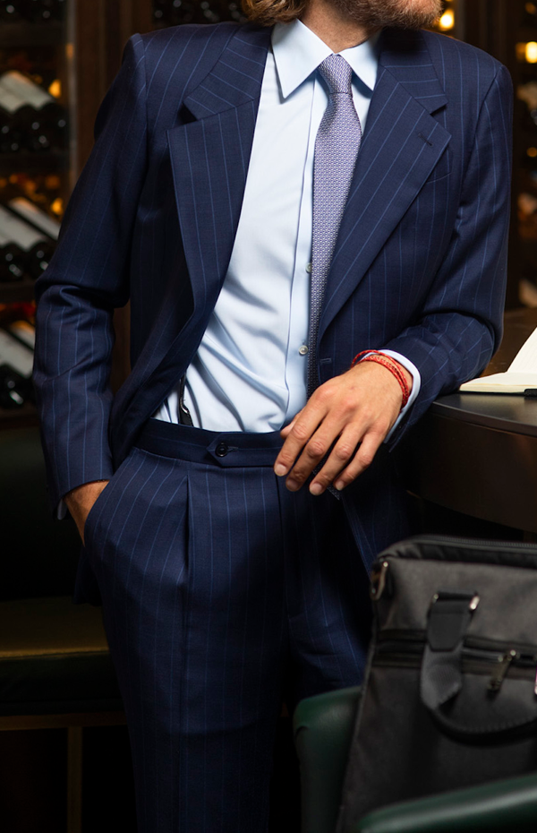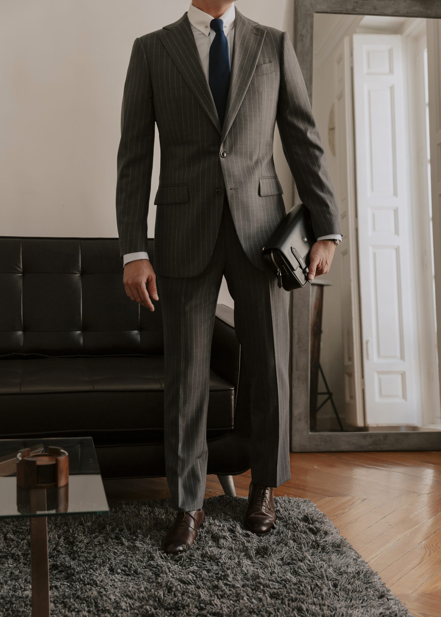 Traje a medida de raya diplomática gris, confeccionado en tejido 100% lana, super 120´s. Cuenta con solapa de muesca con cran alto, bolsillo de pecho en «bachetta» y pantalón con cierre desplazado, ceñidores metálicos y fistel trasero.​