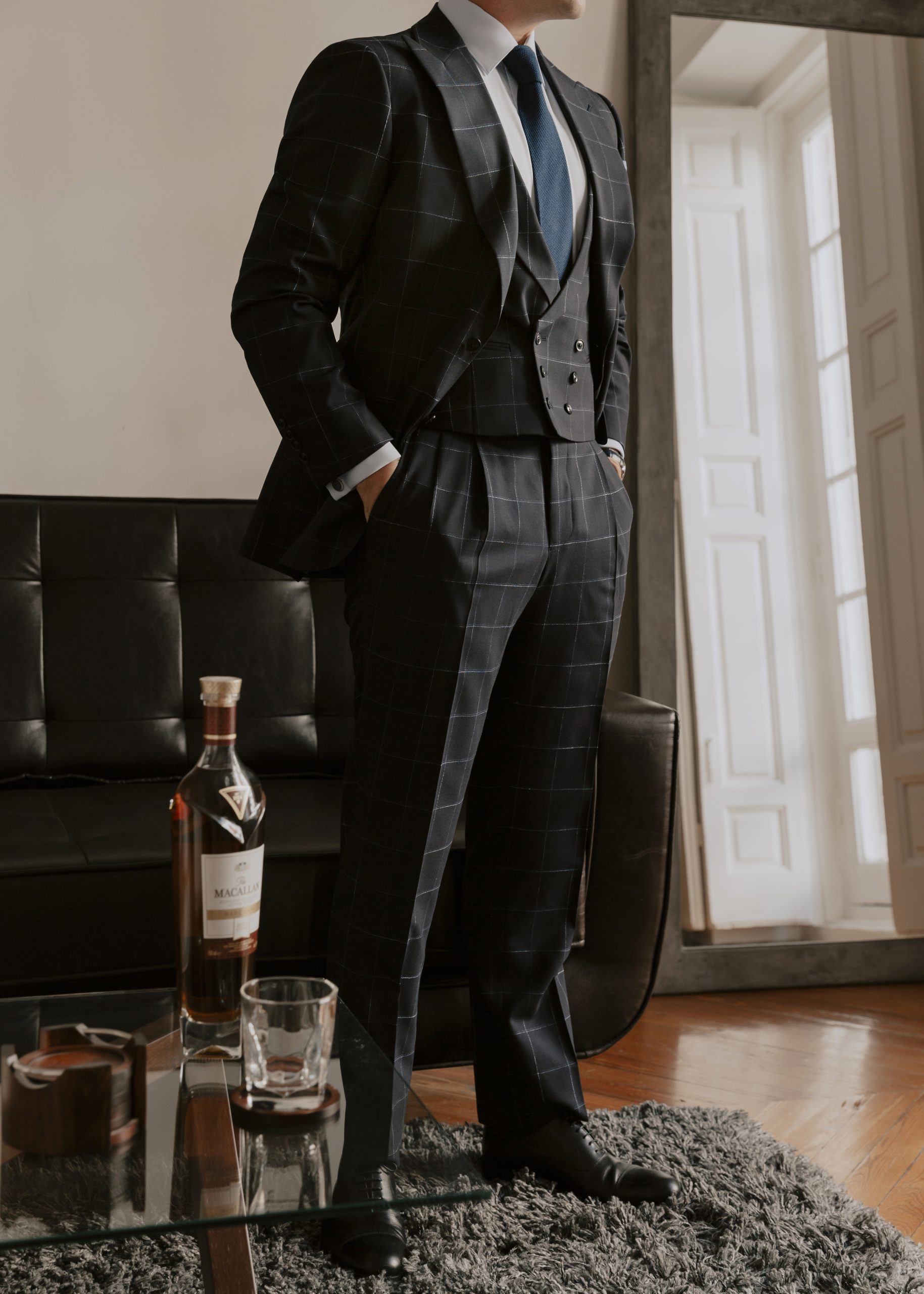 Traje a medida cuadro ventana gris de 3 piezas confeccionado en 100% lana Mohair. Chaqueta con solapa de punta de lanza, chaleco cruzado de 6 botones y pantalón con cierre desplazado y doble pinza delantera.